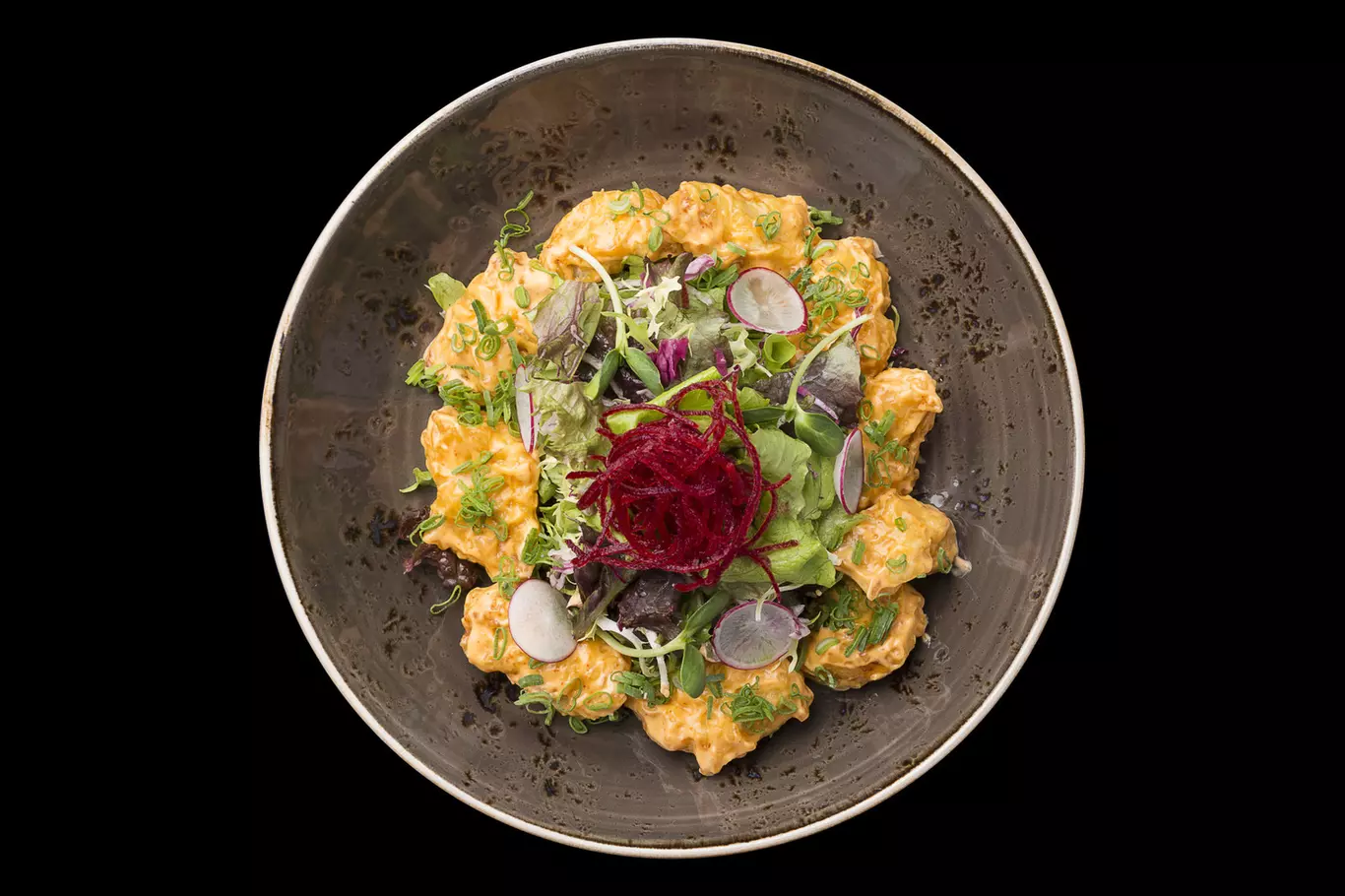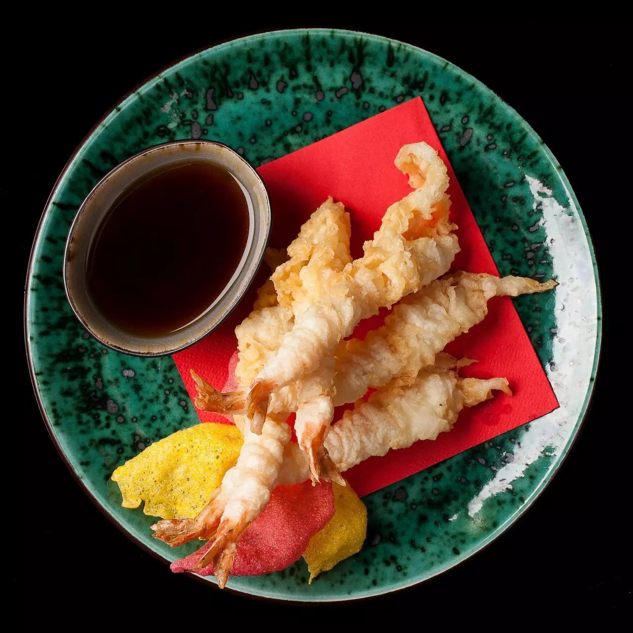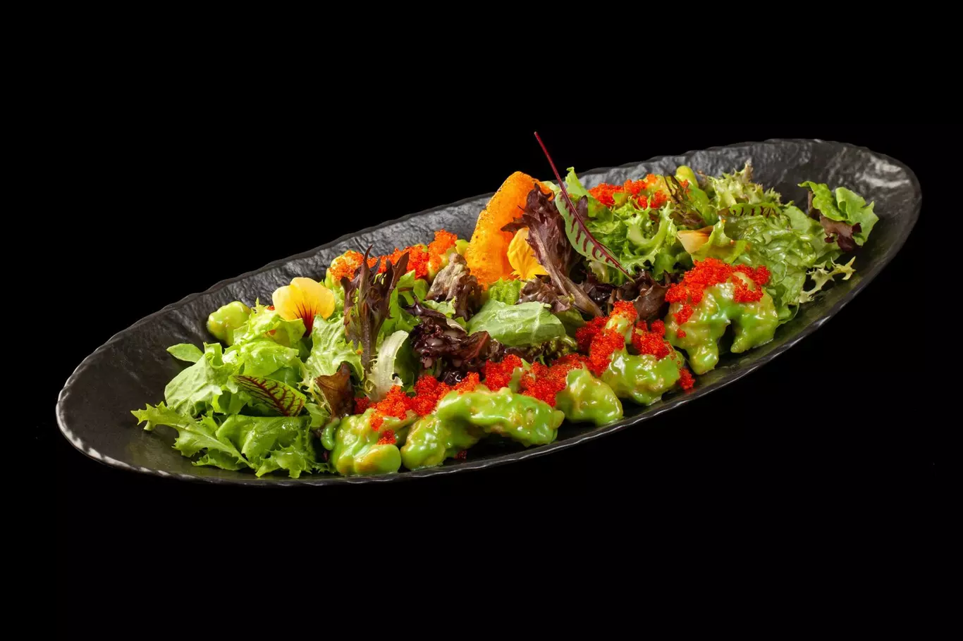 темпура з креветок в соусі васабі, подаються з салатним міксом та ікрою
