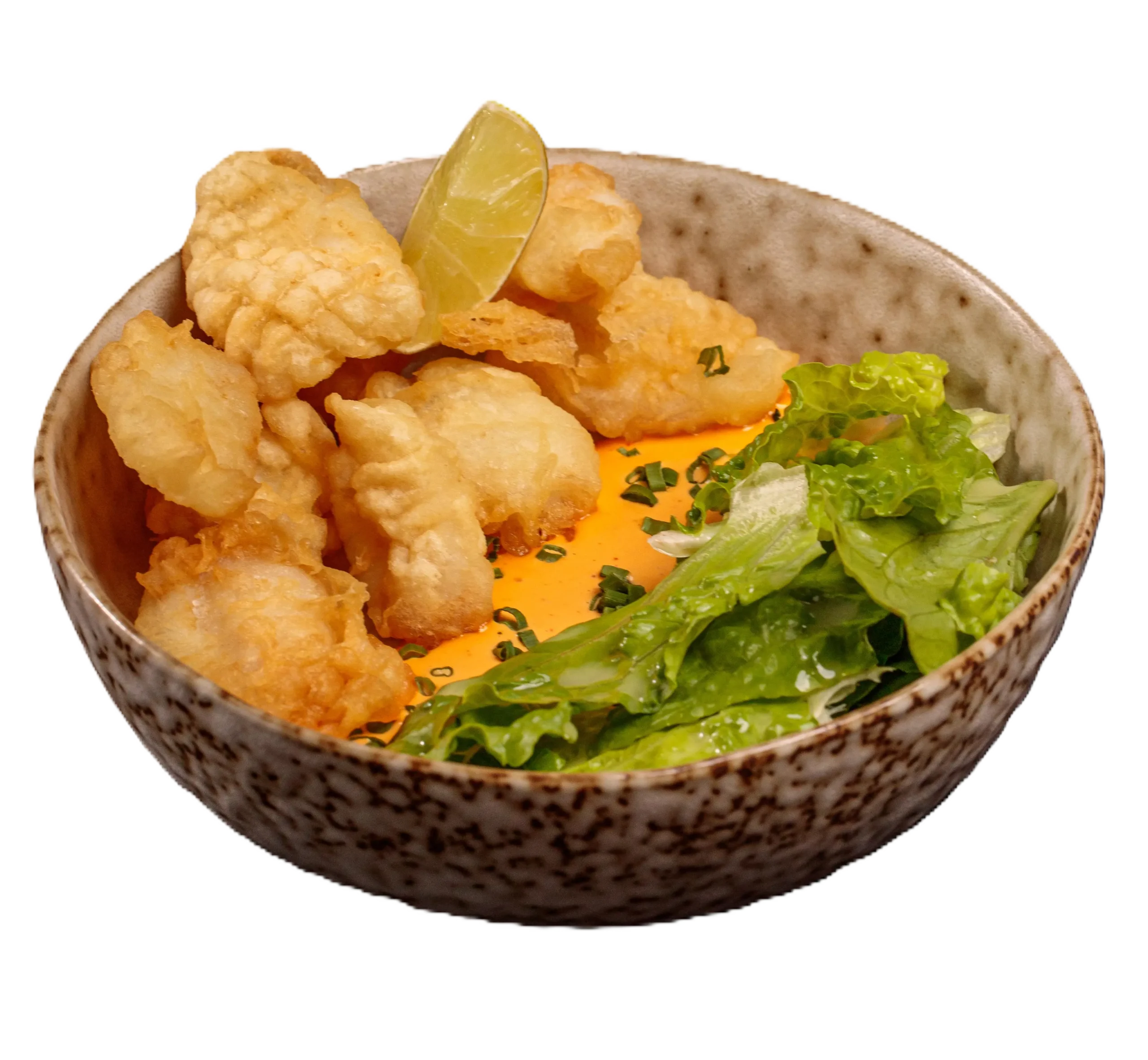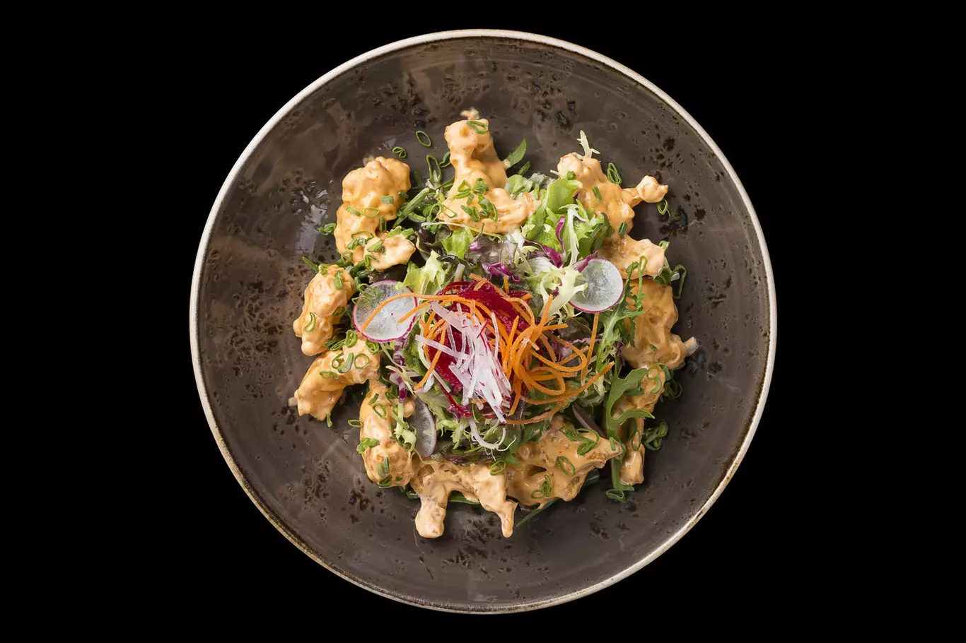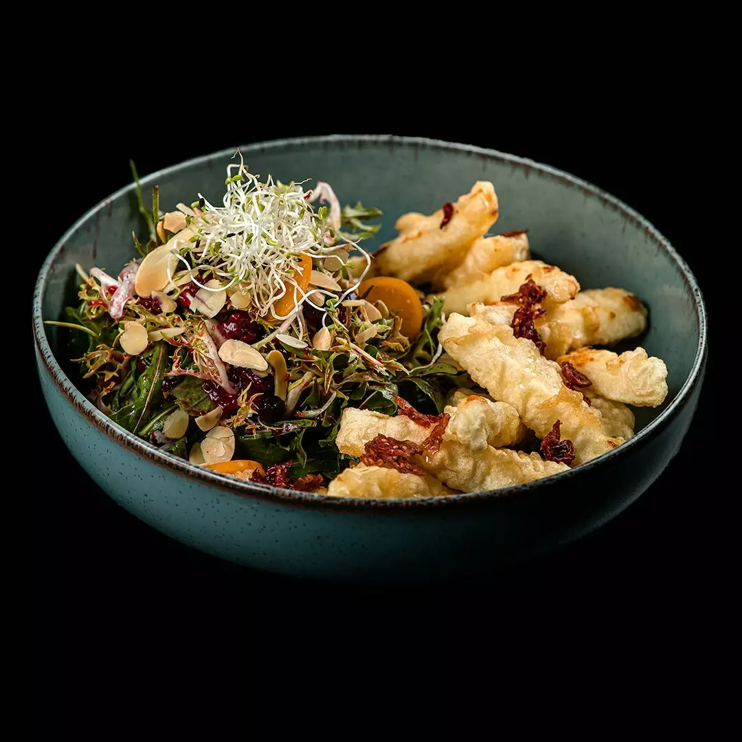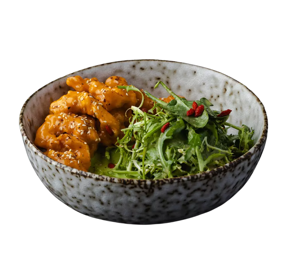 Кальмар бебі, салат рамен, соус спайсі, зелена цибуля