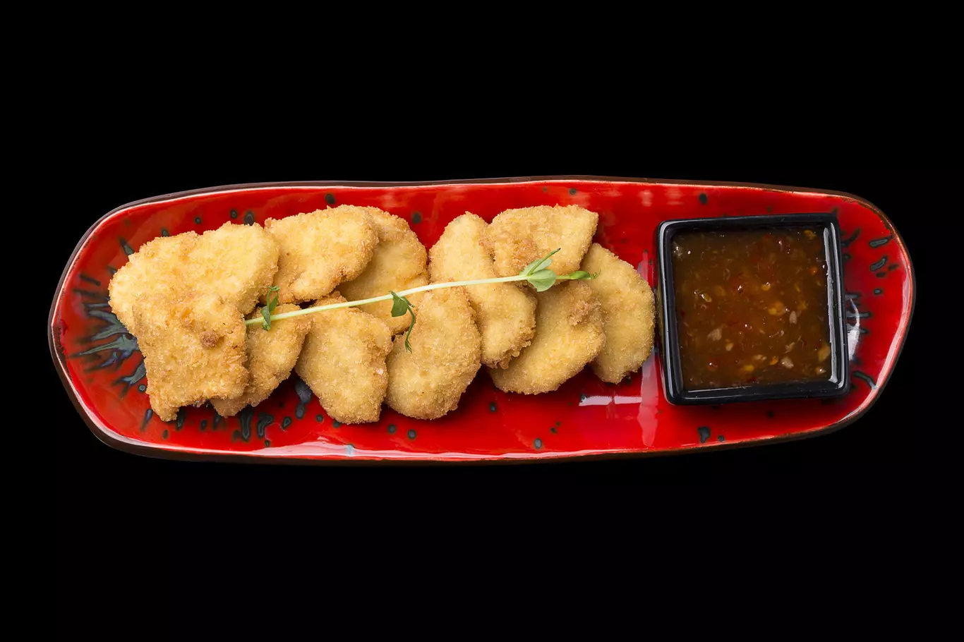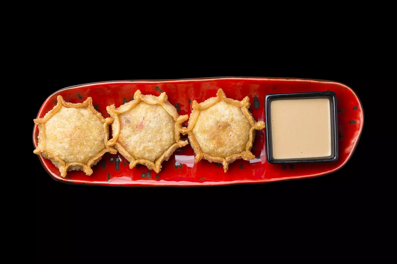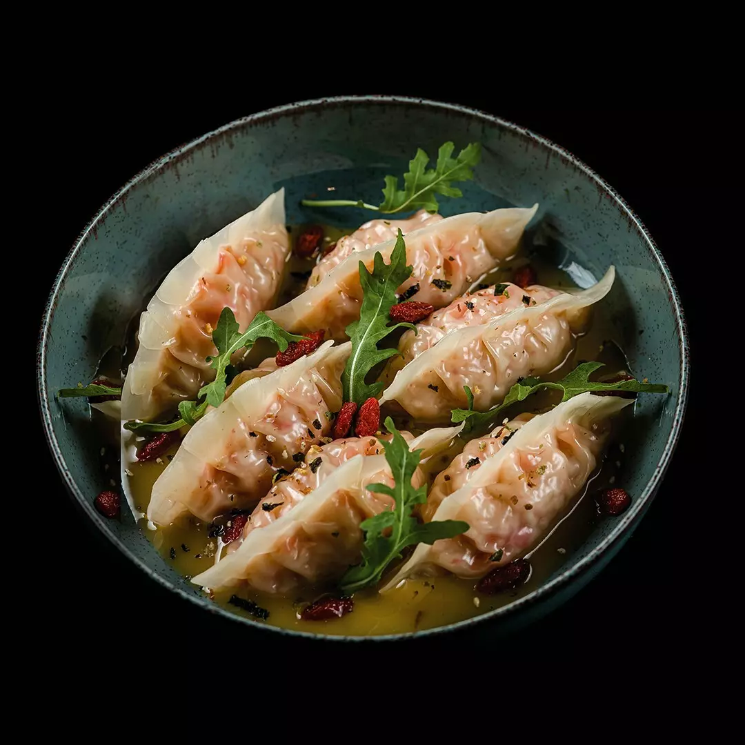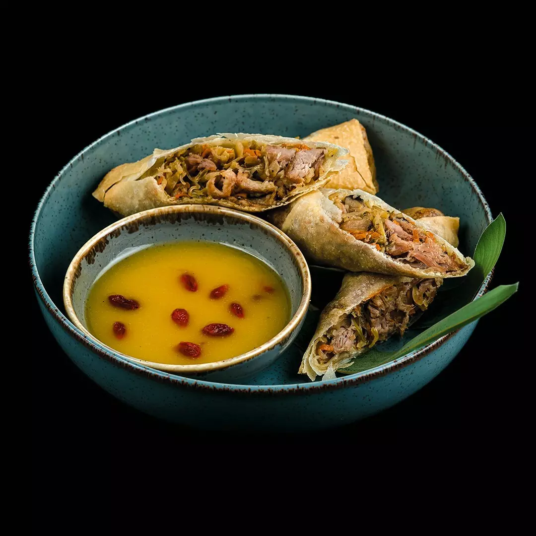 Тісто гьодза, креветка, болгарський перець, соус цитрусовий