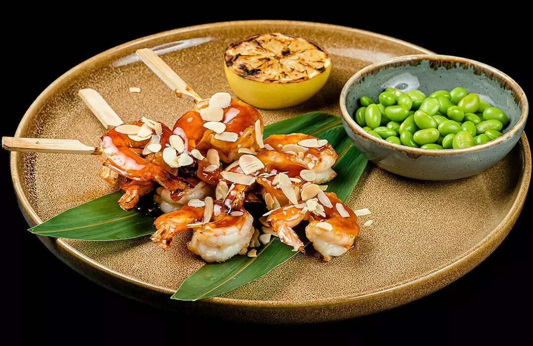 Креветка , соус терiяке, мигдальнi пластiвцi