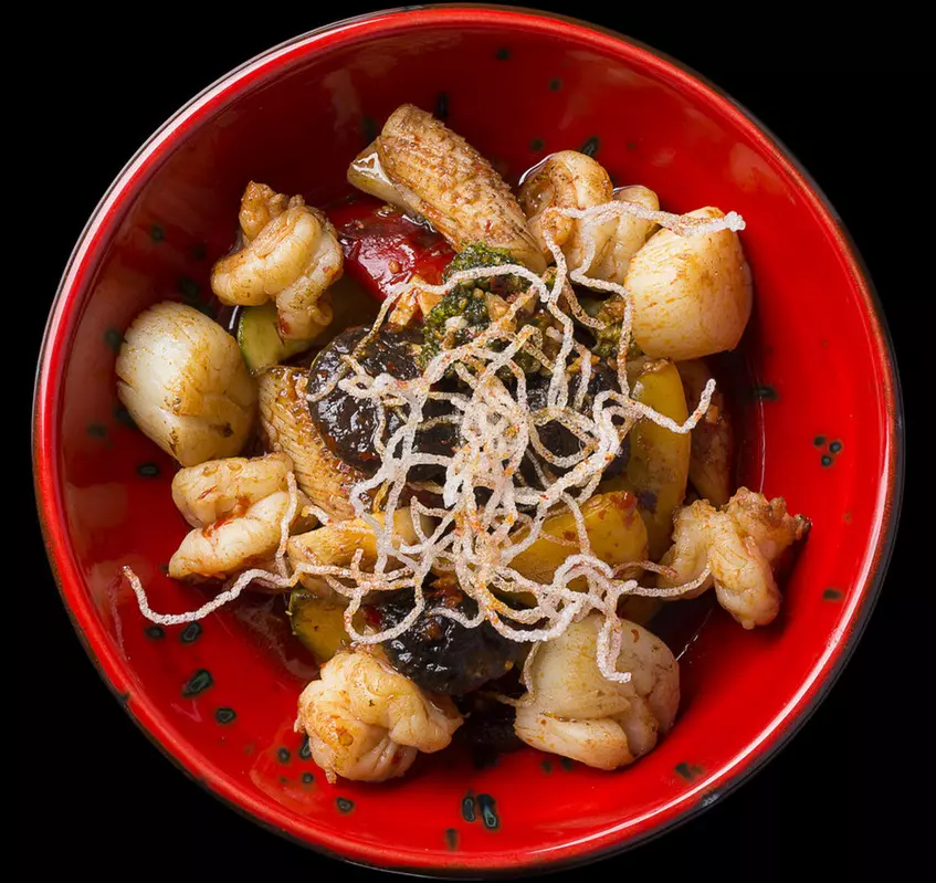 креветка, гребінець, кальмар, броколі, болгарський перець, печериці, кабачок, шиїтаке, гостра часникова паста