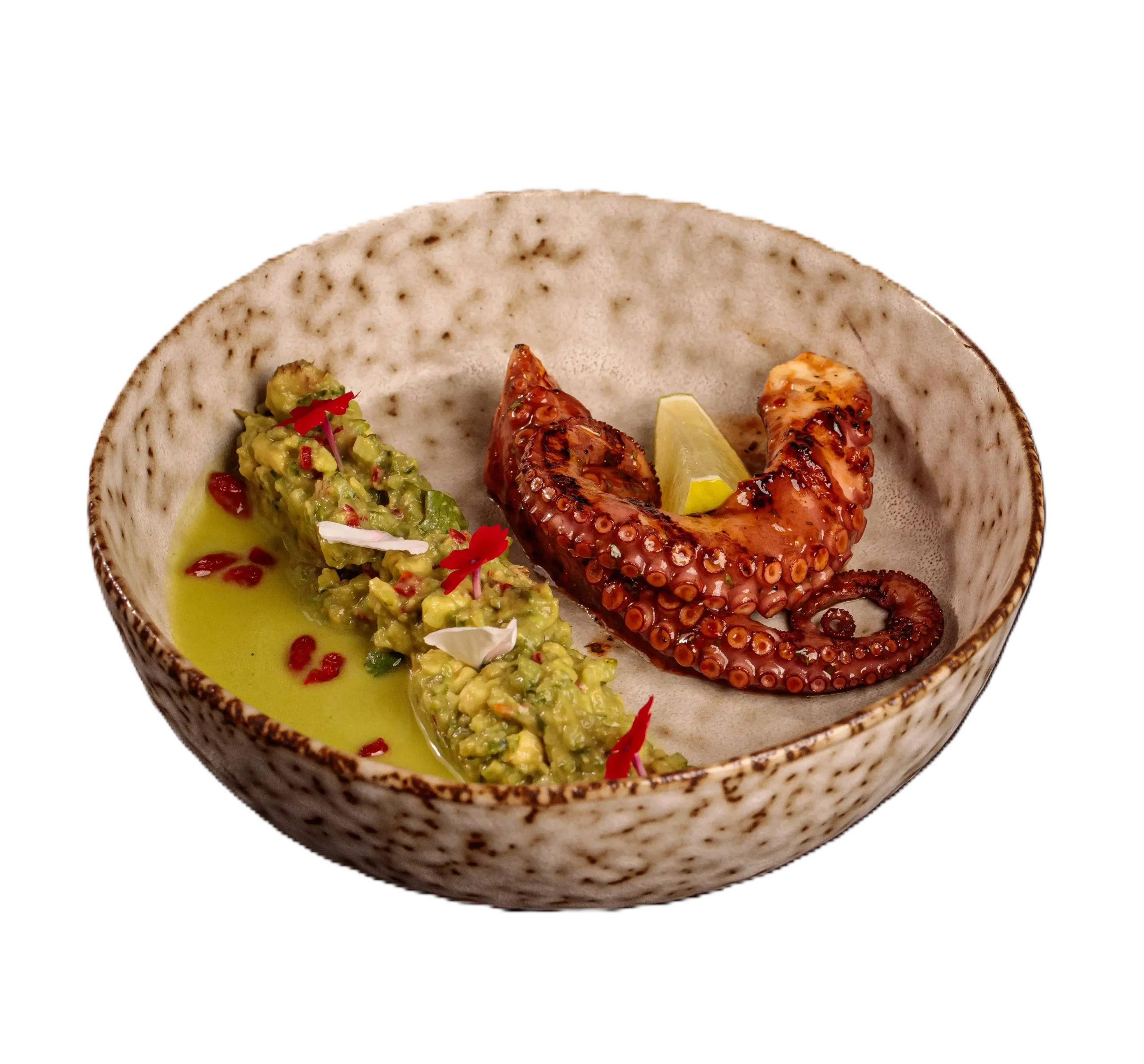 Восьминіг, зелений соус, гуакамоле, ягоди годжи, лайм