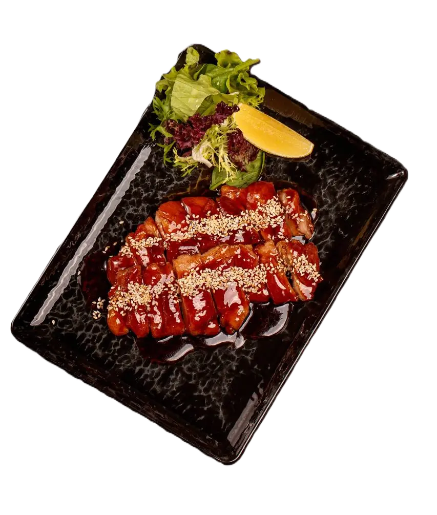 Японське тісто, соєва локшина, капуста, селера, кінза, шиїтаке, качка, подається з соусом манго