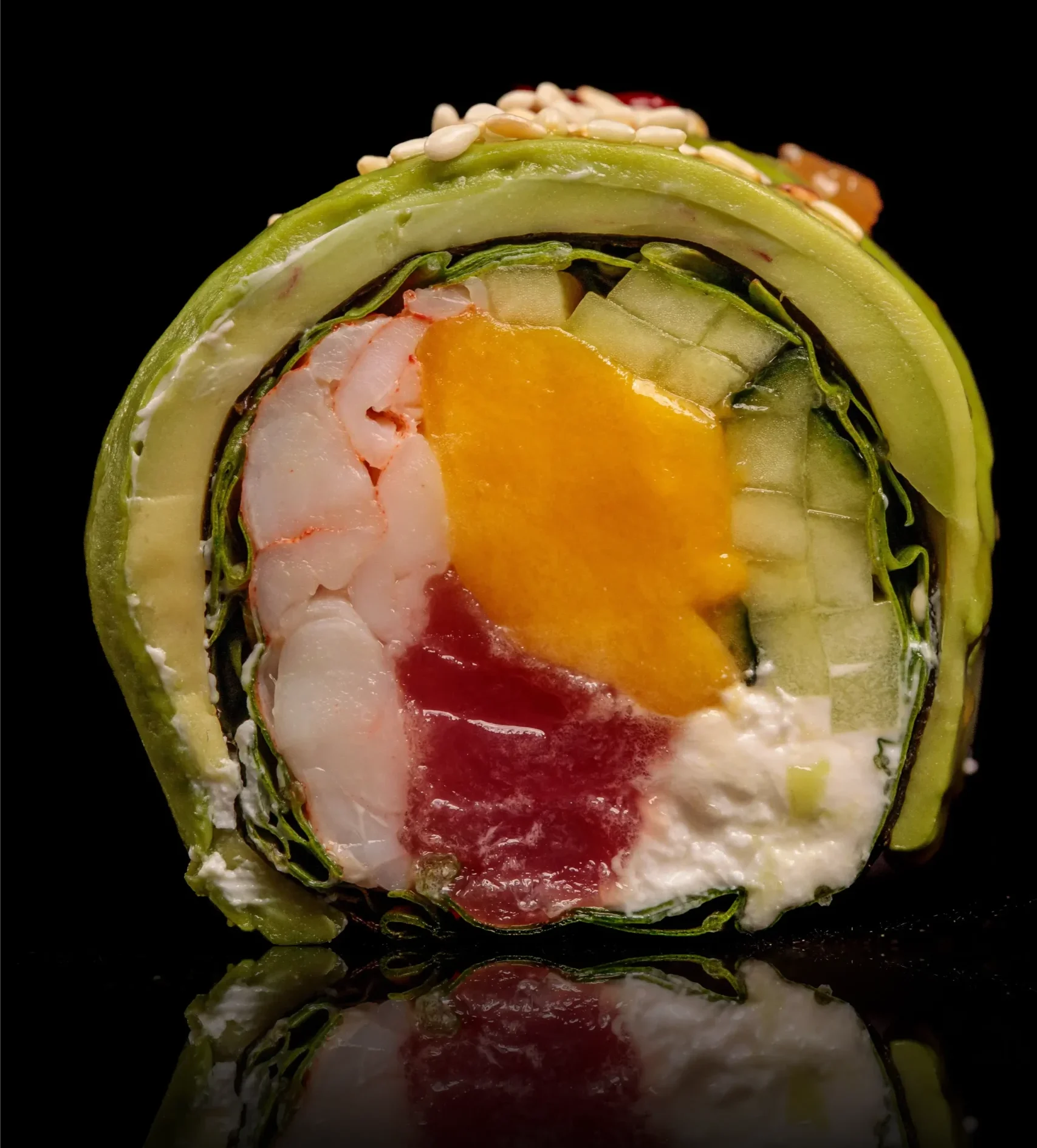 Тунець,креветка, фета, рукола, огірок,манго, авокадо, солодкий чілі, кунжут