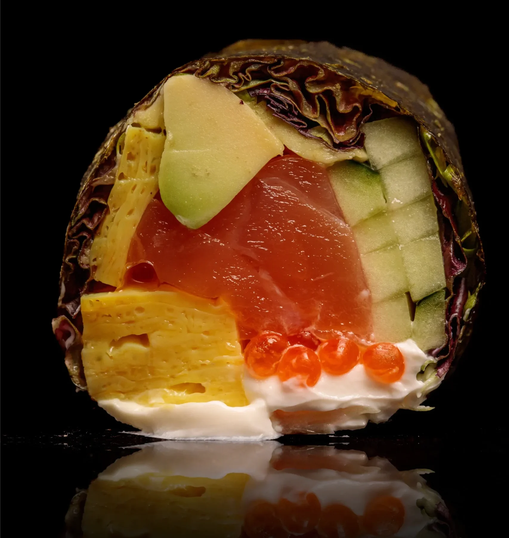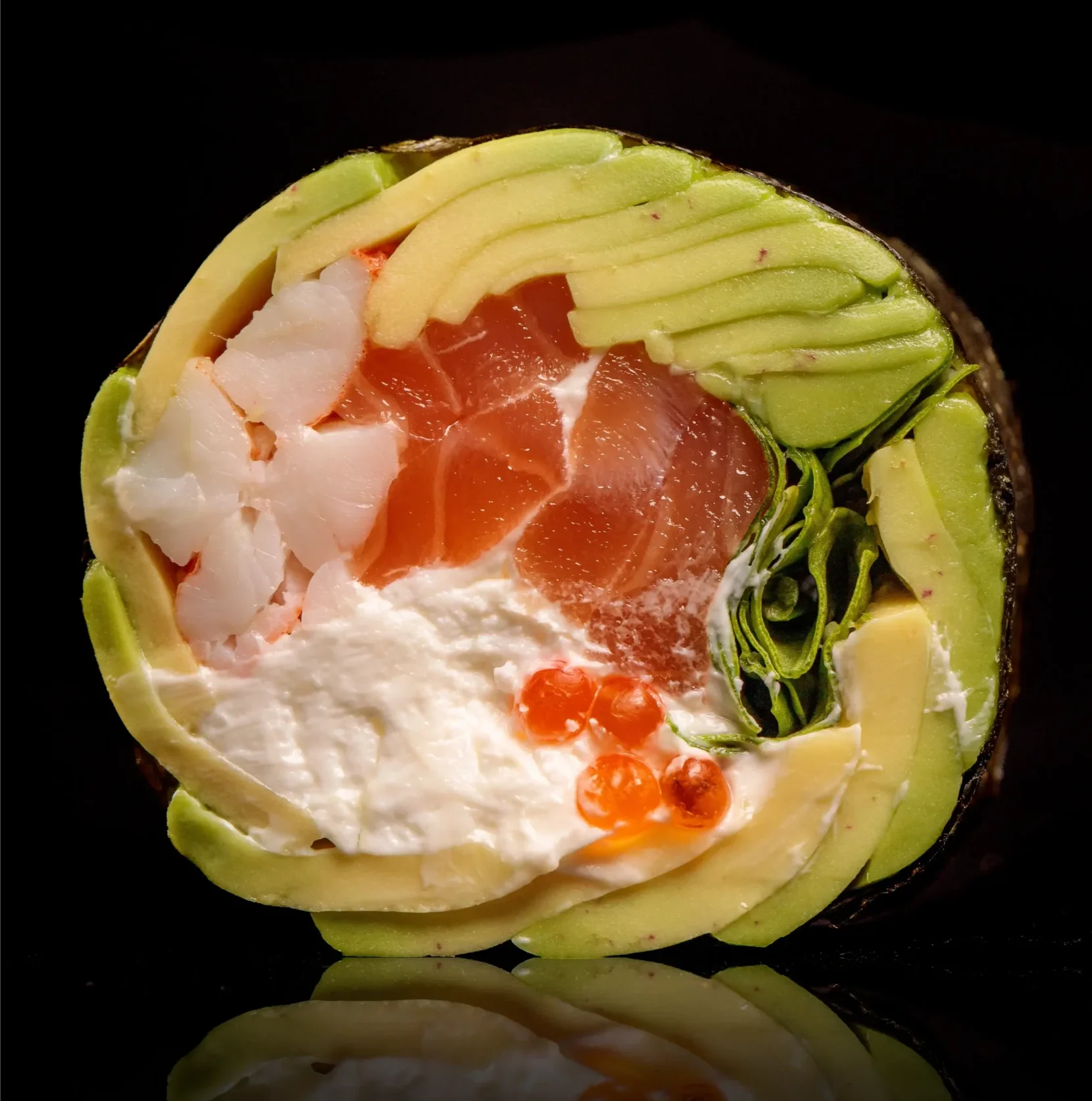 Лосось слабої солі, сир філадельфія, тамаго, ікра червона, мікс салату, авокадо, огірок