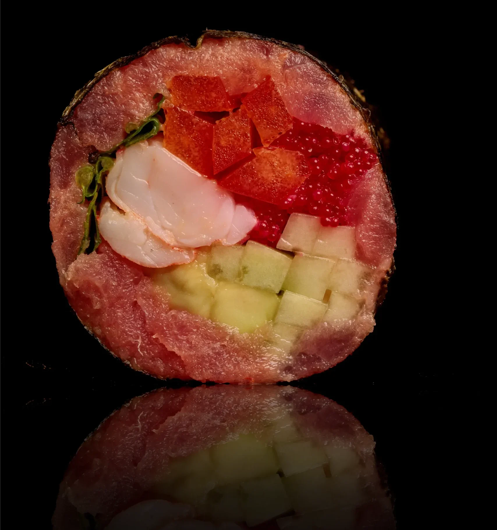 Тунець,креветка, перець болгарський, авокадо, ікра, огірок, рукола, спайсі соус