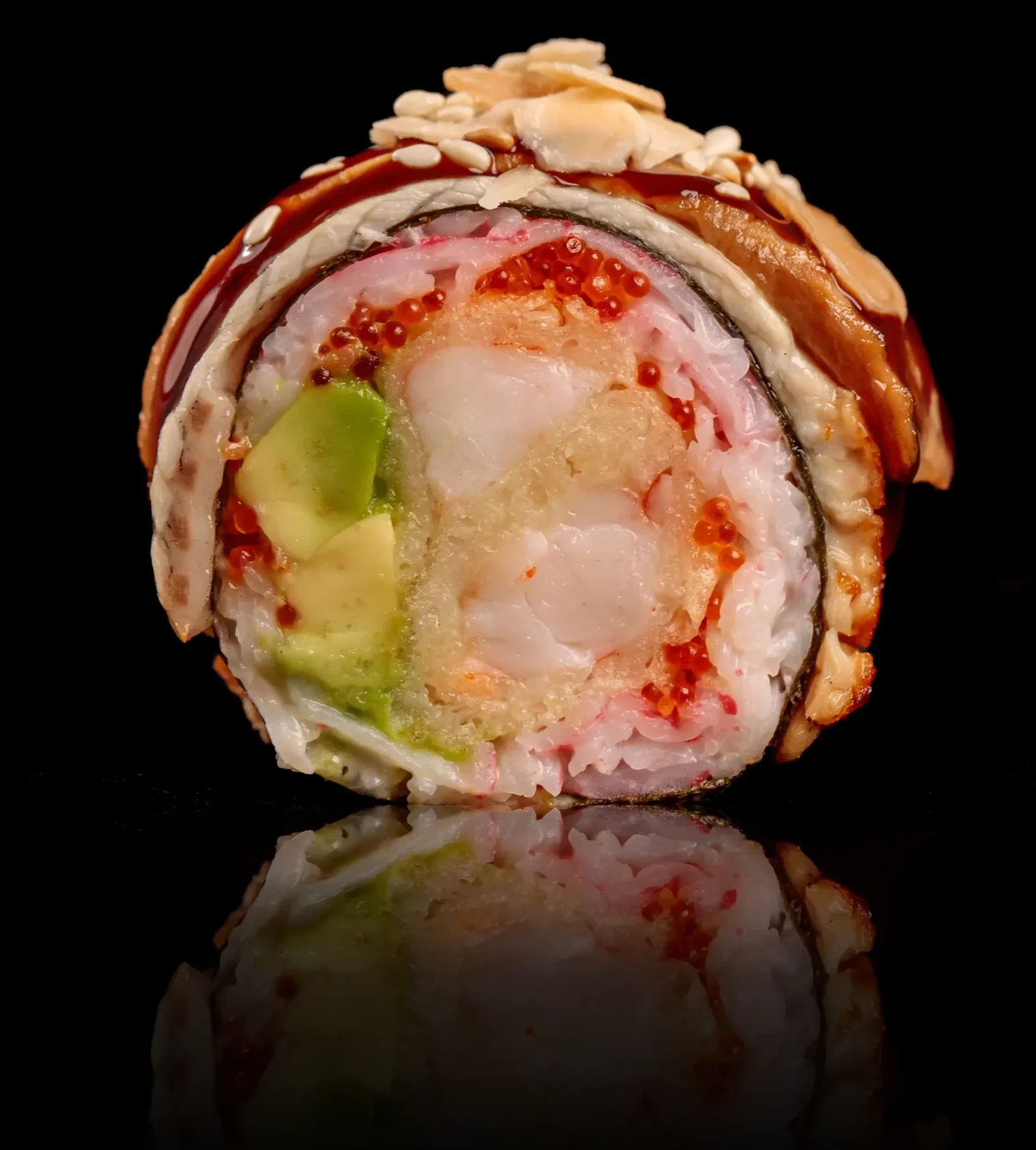 Вугор, “сніжний краб”, сир філадельфія, креветка в темпурі, авокадо, ікра, мигдаль, кунжут